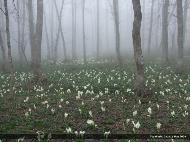 Colony of skunk cabbage in morning haze in Togakushi, Japan. 3296x2472 jpeg image. Visit http://japaneselandscape.appspot.com/ for other photos.